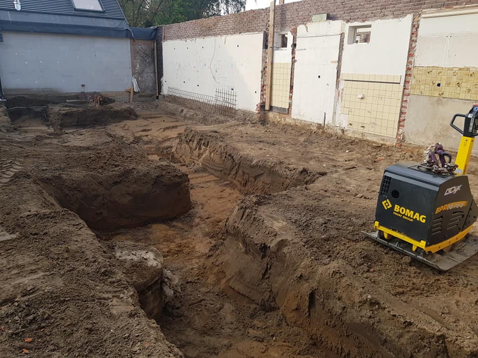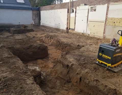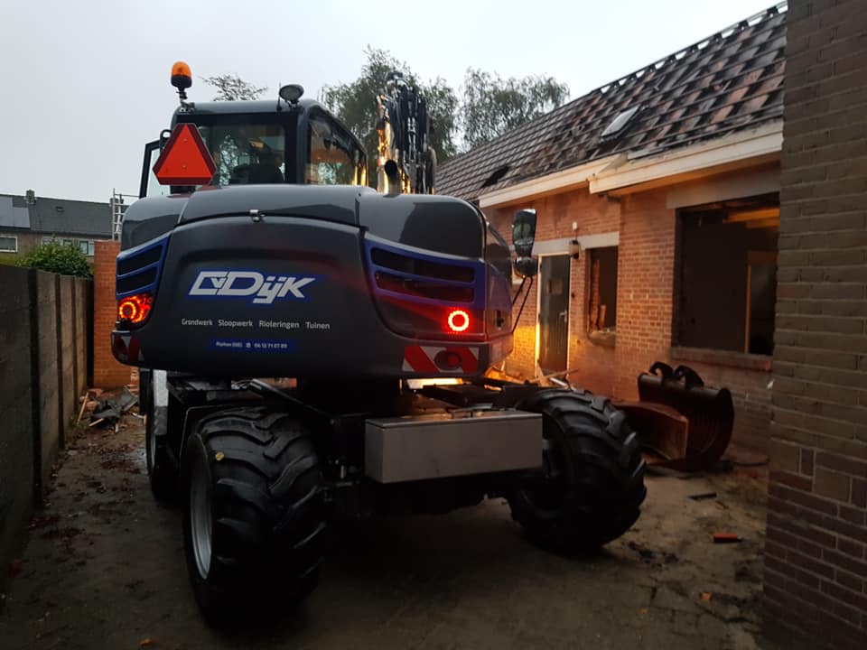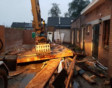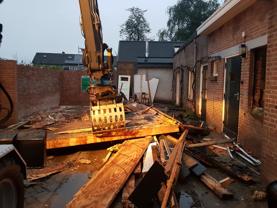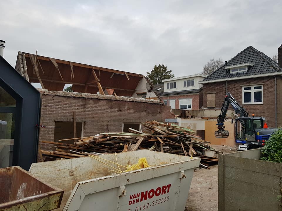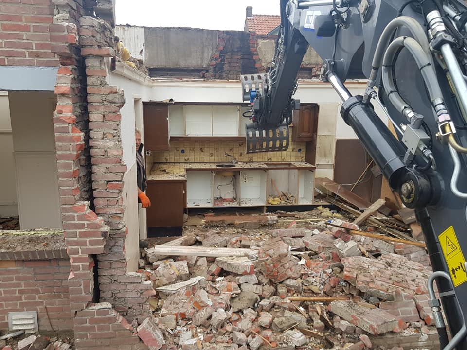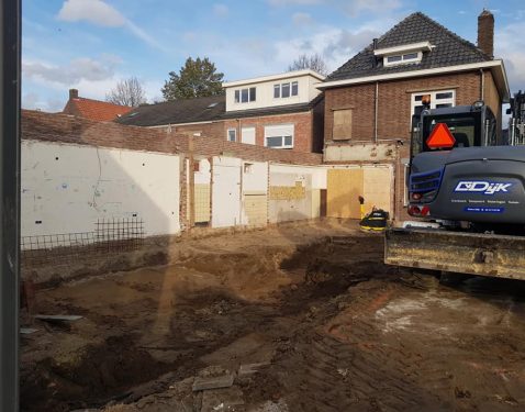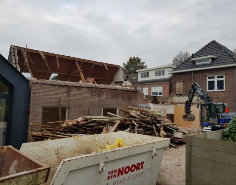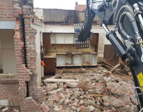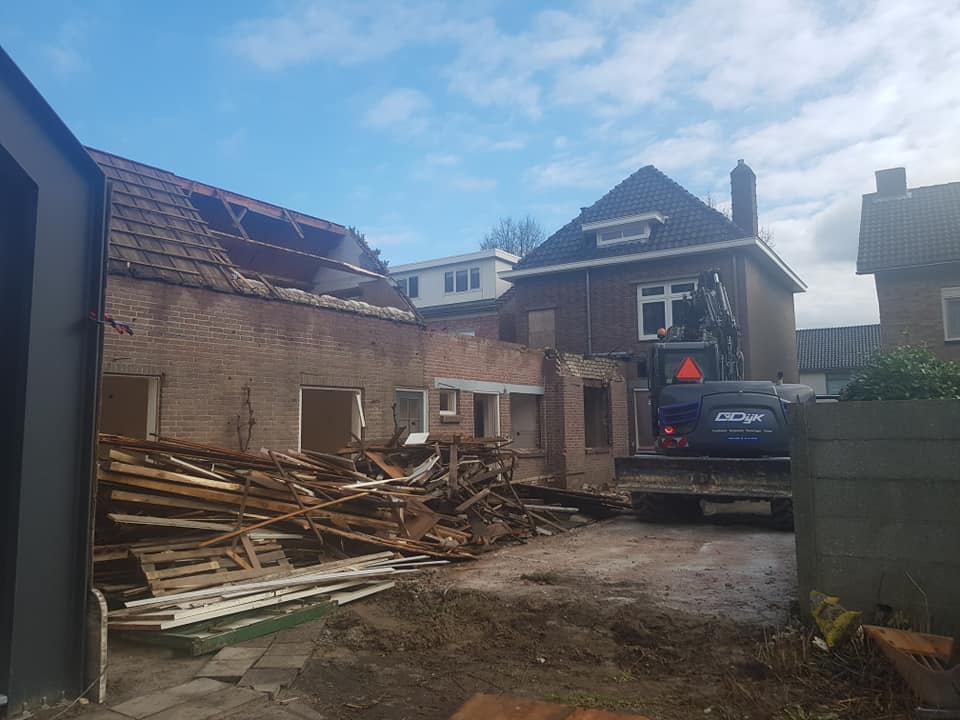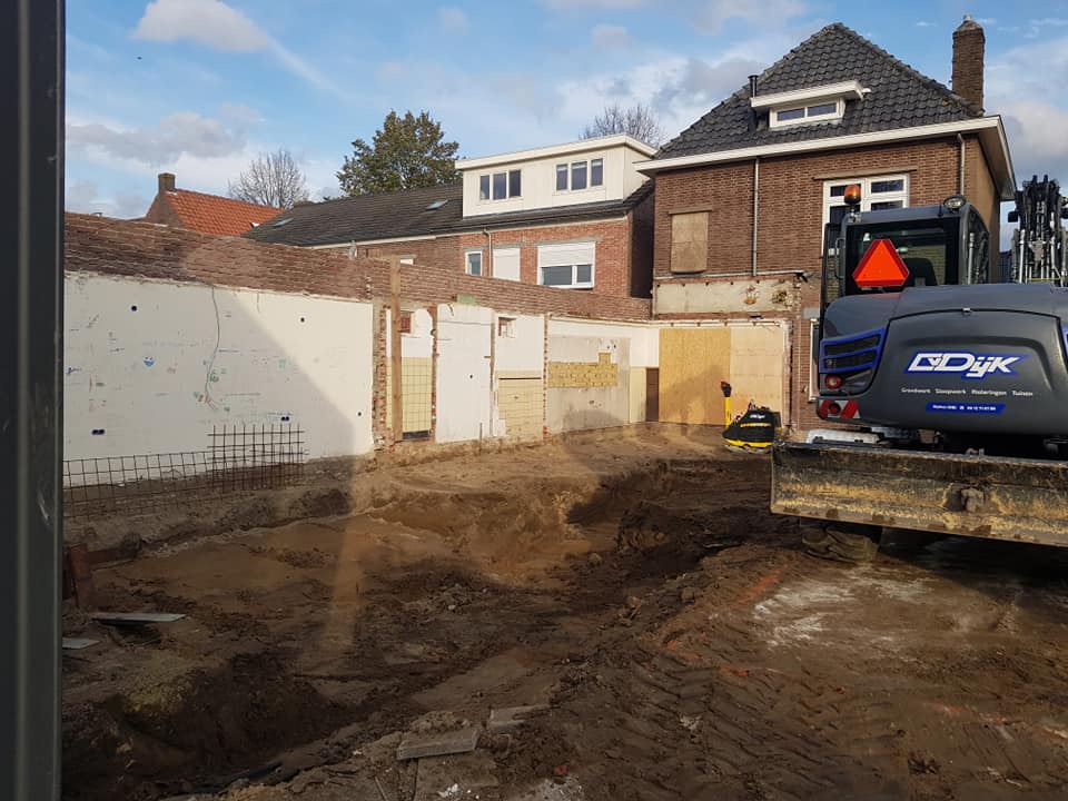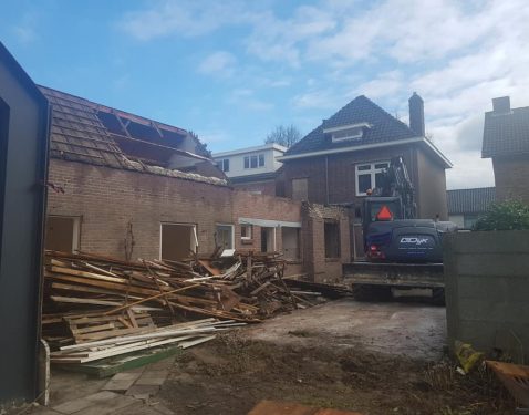Op onderstaande foto’s is te zien hoe we met alle precisie een gebouw tussen twee te behouden gebouwen uit sloopten, waarbij ook nog een muur gespaard moest blijven. Ook het grondwerk verzorgden we voor het na de sloop nieuw te bouwen huis.