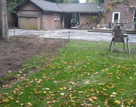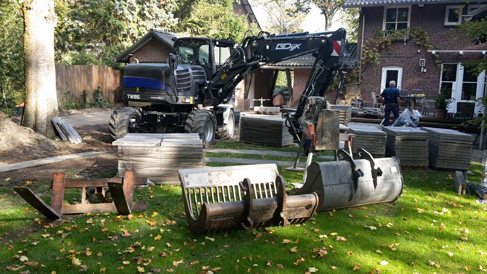 We hebben een terras van 150m2 vervangen. Door middel van de nieuwe graafmachine hadden we de oude tegels er zo. En de nieuwe tegels er zo in door deze machinaal te leggen. Hierna volgt nog de aanplanting.